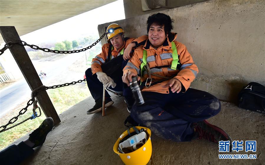 高铁桥隧工在京沪高铁线路上的丹昆特大桥检修口休息(12月3日摄)。 新华社发(张诗影 摄)