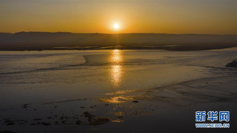 12月4日无人机拍摄的黄河合阳段日出景色。 清晨,在黄河陕西省合阳段,河滩在朝霞的映照下,景色迷人。 新华社记者陶明摄