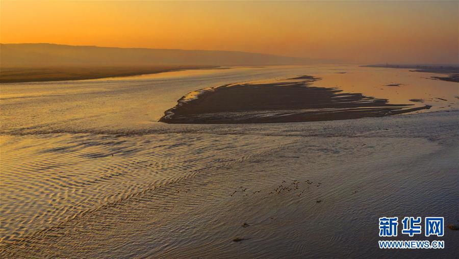 12月4日,一群鸟儿迎着朝霞在黄河合阳段飞翔(无人机拍摄)。 清晨,在黄河陕西省合阳段,河滩在朝霞的映照下,景色迷人。 新华社记者陶明摄