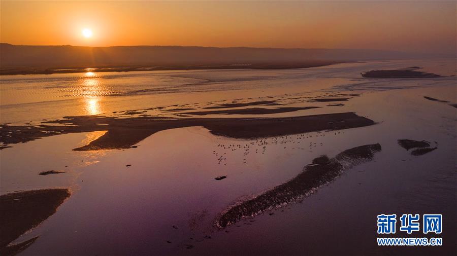 12月4日无人机拍摄的黄河合阳段日出景色。 清晨,在黄河陕西省合阳段,河滩在朝霞的映照下,景色迷人。 新华社记者陶明摄