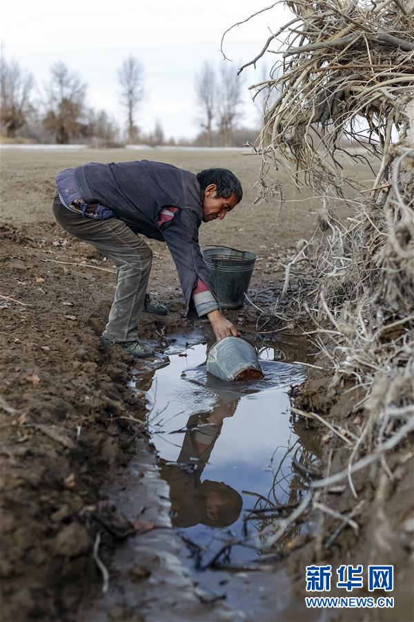 在新疆于田县达里雅布依乡五小队,依明·买提库尔班从家附近的一个小水洼里打水喂羊(11月15日摄)。 新华社记者 沈伯韩 摄