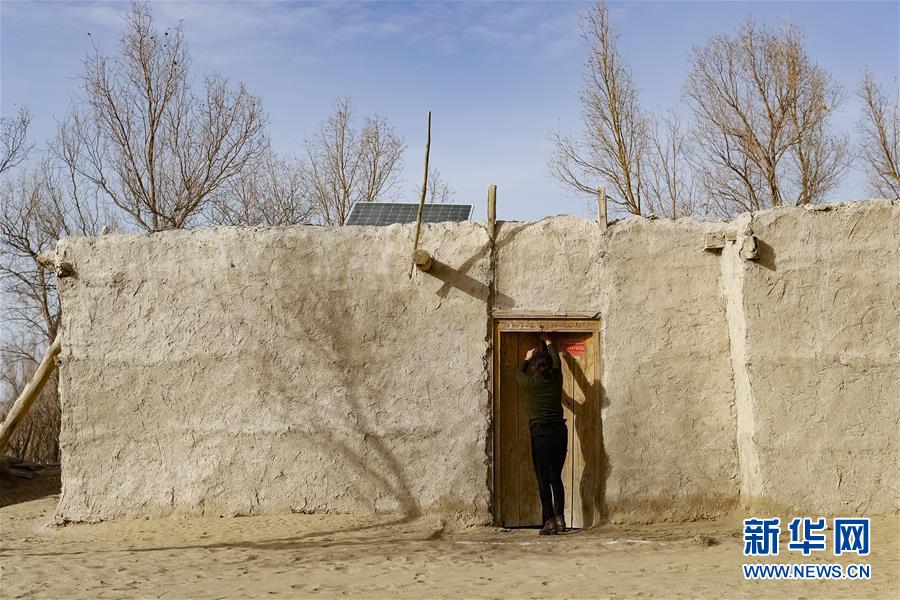 在新疆于田县达里雅布依乡五小队,依明·买提库尔班的妻子艾比比汗·达曼把老房子的门关好,准备出发前往安置点(11月17日摄)。 新华社记者 沈伯韩 摄