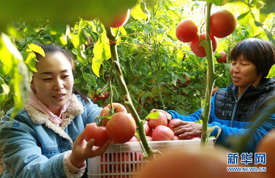 12月4日,南和县郝桥镇东郑庄村驻村党员(左)帮助农户采摘西红柿。 河北省邢台市南和县不断推进“党支部+合作社+农户”党建扶贫发展模式,以特色产业为抓手,有效促进农业增效和农民增收。 新华社发(张驰 摄)