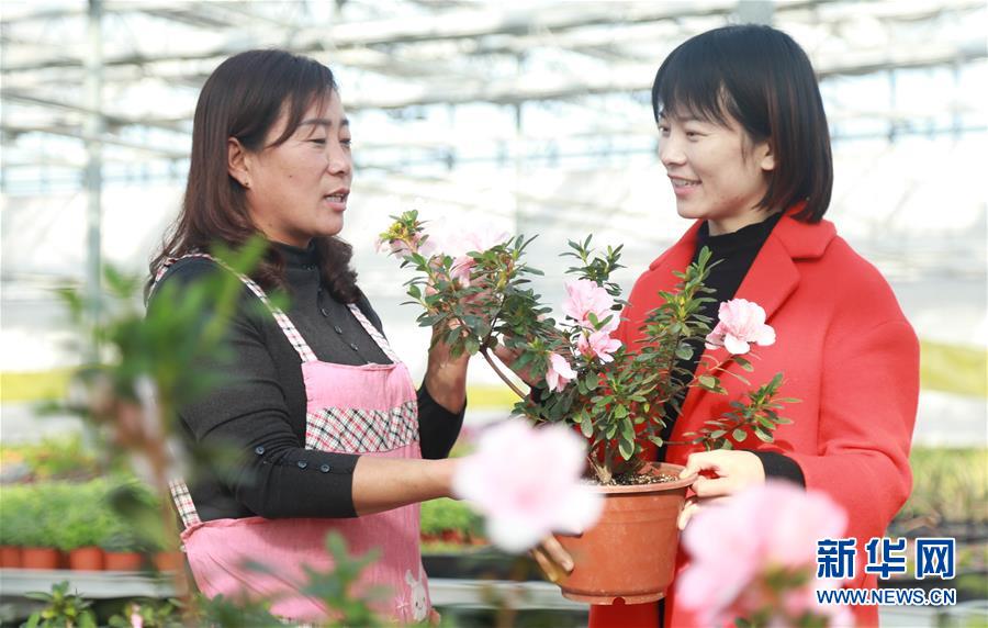 12月4日,南和县贾宋镇驻村党员(右)向农户了解花卉生长和销售情况。 河北省邢台市南和县不断推进“党支部+合作社+农户”党建扶贫发展模式,以特色产业为抓手,有效促进农业增效和农民增收。 新华社发(张驰 摄)