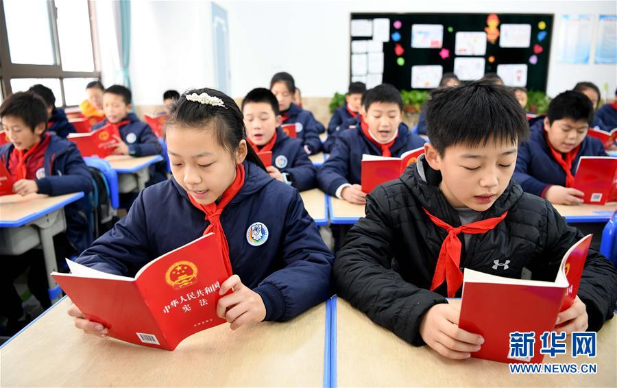 12月4日,合肥市翡翠学校的学生在诵读宪法。 当日是国家宪法日,安徽省合肥市翡翠学校举办主题宣讲活动,对学生开展法治教育,帮助孩子们了解宪法知识。 新华社记者刘军喜摄