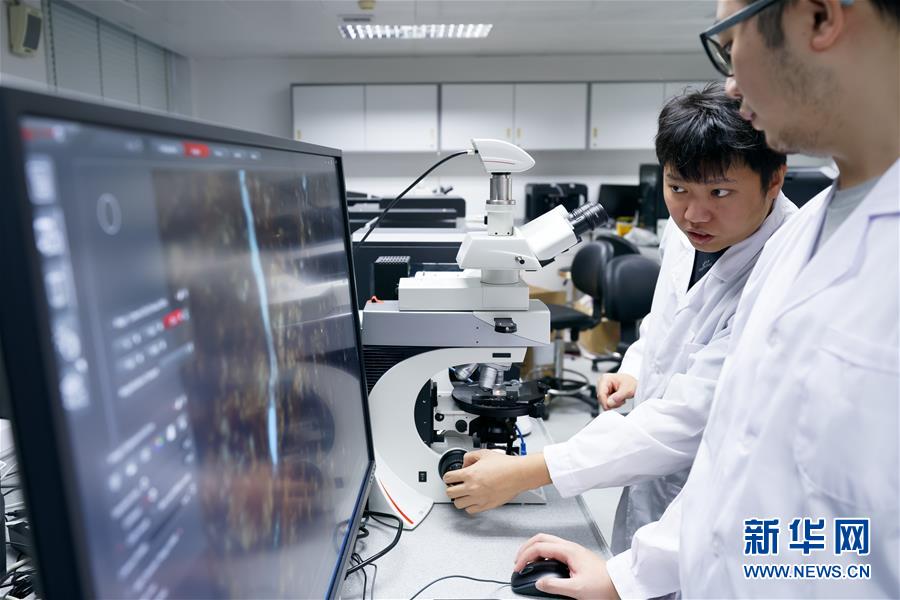 在澳门科技大学月球与行星科学国家重点实验室,邓志培(后)与学生观测陨石切片(10月31日摄)。 新华社记者 刘金海 摄