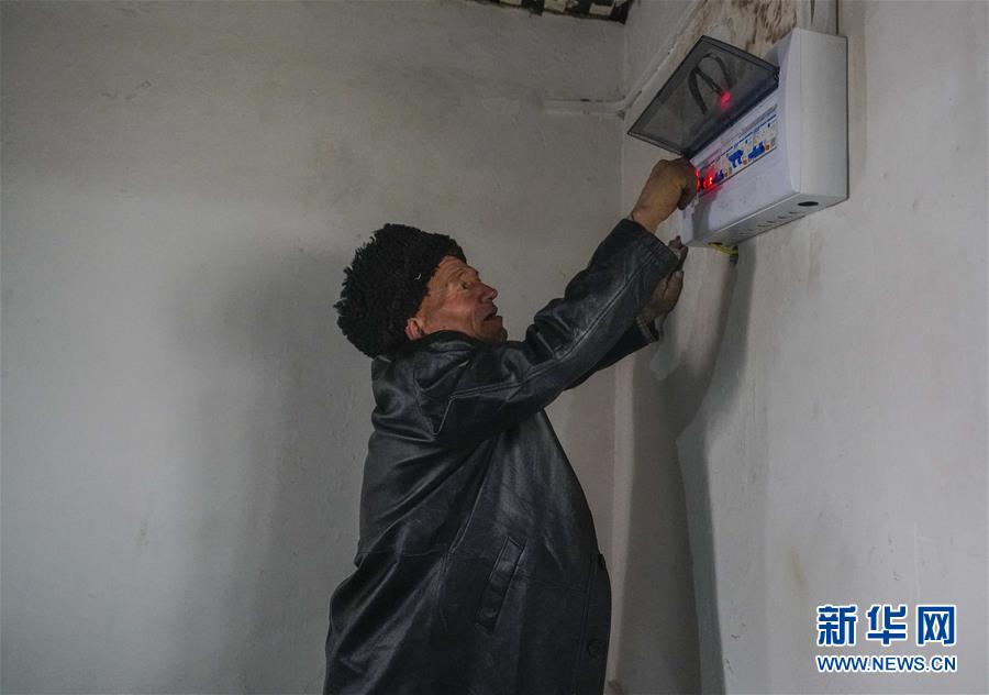 在新疆和田地区和田县布扎克乡布扎克村,村民买吐送·巴克在家中查看电采暖设备开关(11月24日摄)。新华社记者 赵戈 摄