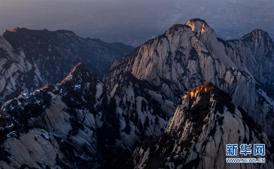 12月4日,一抹霞光照耀在西岳华山的北峰周围(无人机拍摄)。 冬日的华山,在夕阳的映照下,绽放出炫目的色彩,与蓝色的天空、金色的晚霞构成壮美的画卷。 新华社记者陶明摄