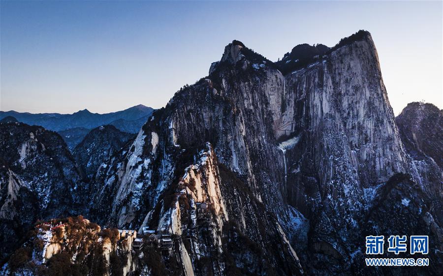 12月4日无人机拍摄的西岳华山。 冬日的华山,在夕阳的映照下,绽放出炫目的色彩,与蓝色的天空、金色的晚霞构成壮美的画卷。 新华社记者陶明摄