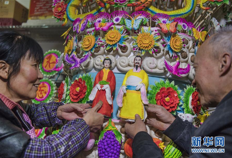 12月4日,李金贤和丈夫一起在制作取材于民间故事的大型花馍。新华社记者陶明摄