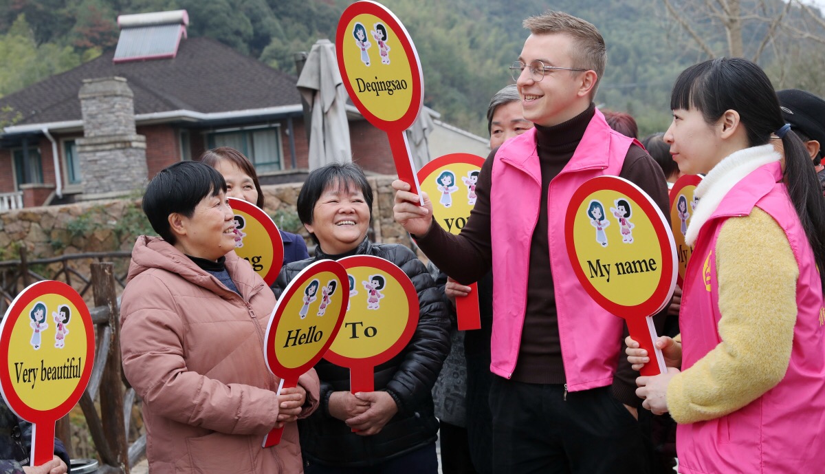 2019年12月4日,浙江省湖州市德清县武康街道对河口村,来自乌克兰的“德清嫂”志愿者Sergi向村民和民宿阿姨教授日常使用的英语口语。(谢尚国摄/光明图片)