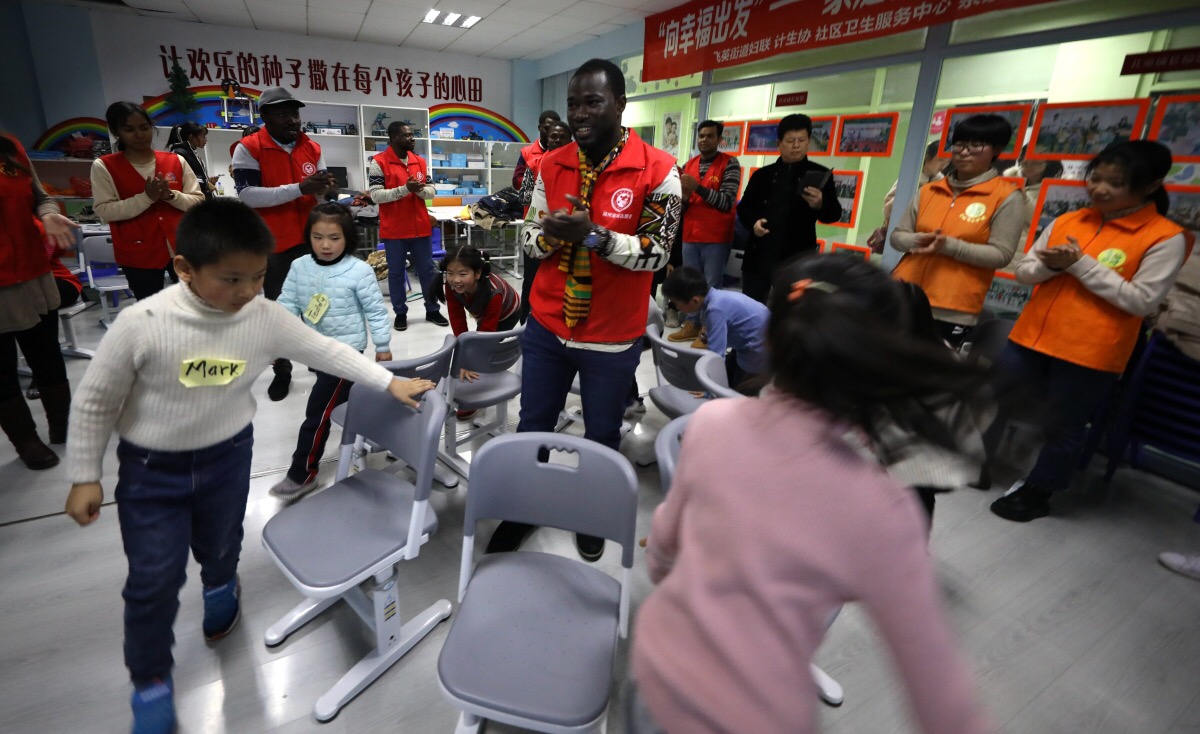 2019年12月4日,浙江省湖州市吴兴区飞英街道余家漾社区的“三点半”公益课堂上,来自湖州师范学院的留学生志愿者给放学后的孩子免费课程辅导和互动游戏。(吴建勋摄/光明图片)