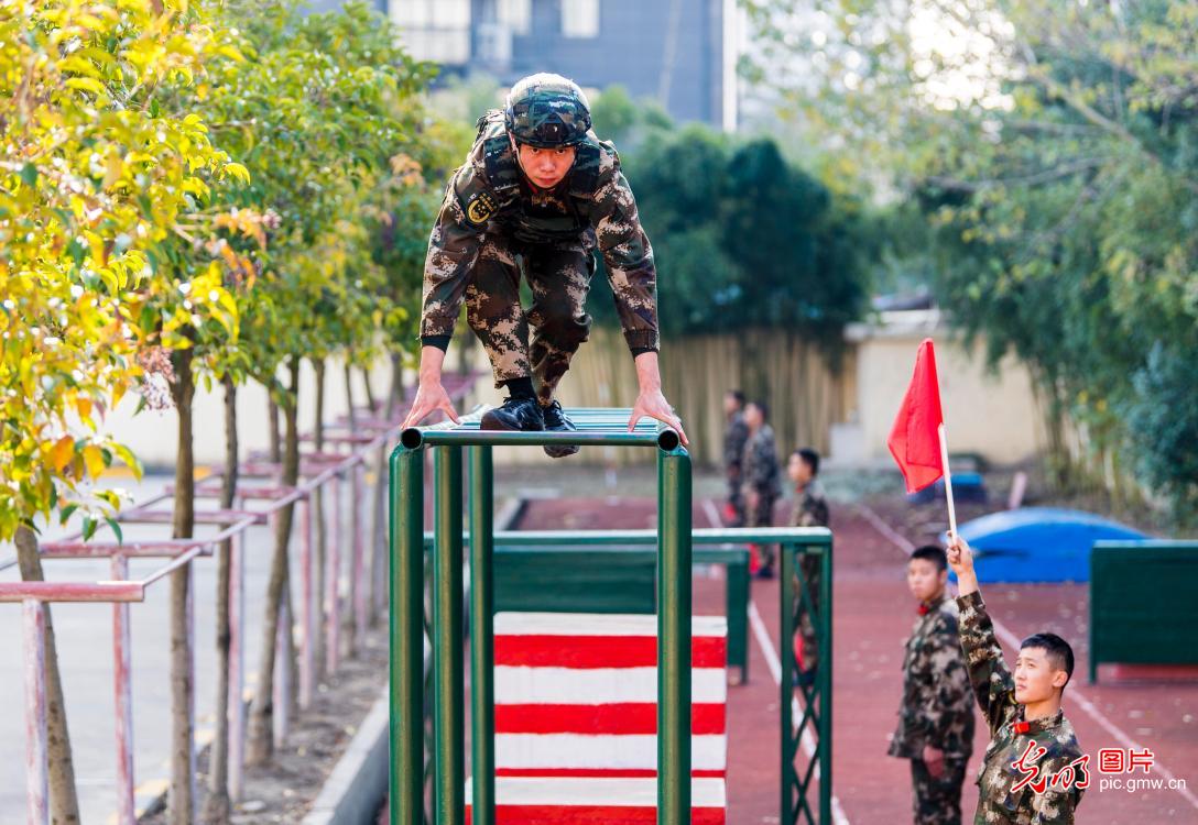 2019年12月4日,武警江苏省总队泰州支队以入冬时节为契机,开展体能、技能训练,以提高官兵整体素质,锤炼官兵能打仗、打胜仗的过硬能力。图为官兵正在进行障碍科目训练。(杨玉岗摄/光明图片)