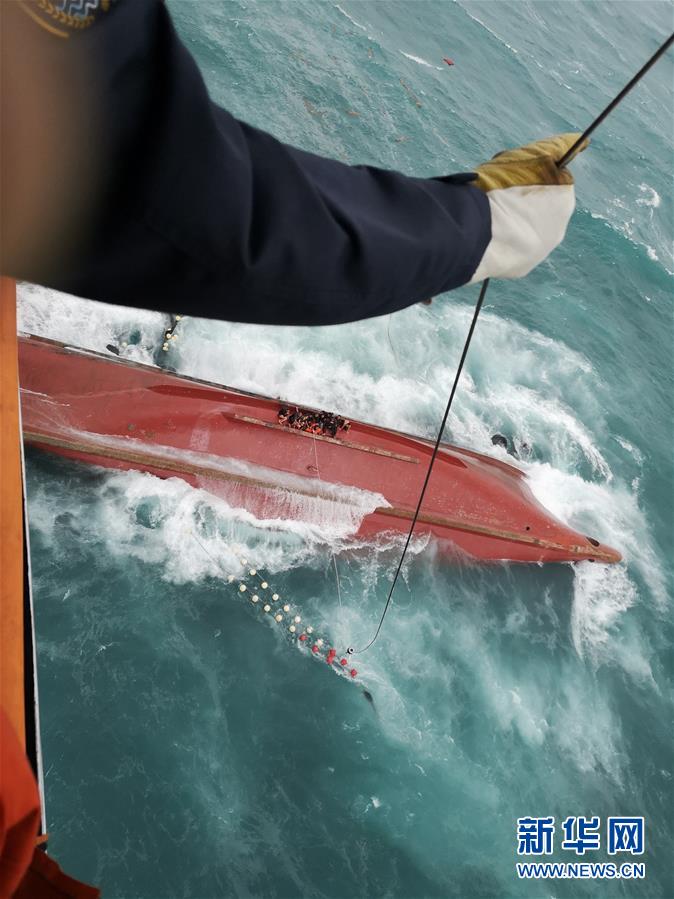 12月5日,救援人员在直升机上对“闽狮渔07705”轮船员展开空中施救。 新华社发(福建省海上搜救中心供图)