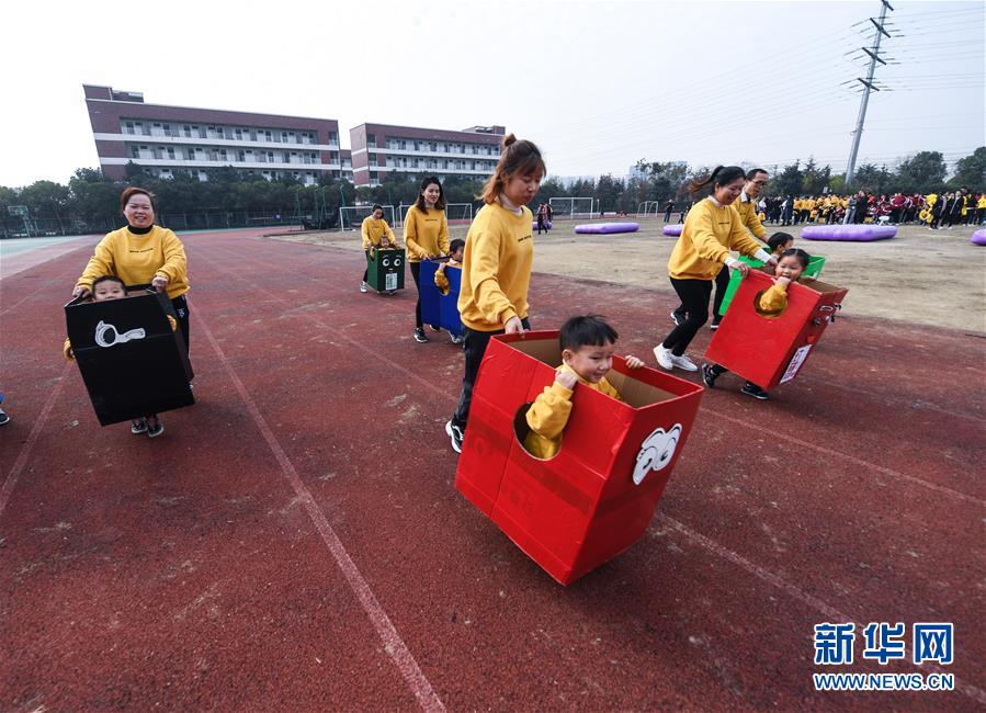 12月5日,家长和孩子们带着趣味垃圾桶,参加垃圾跑跑跑游戏。 新华社记者 徐昱 摄