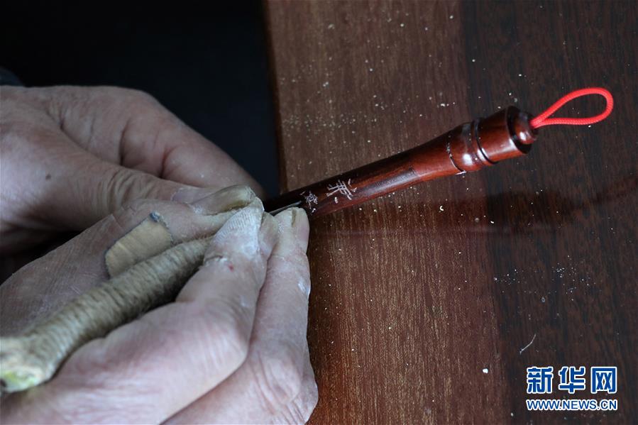 12月4日,佘征军在泾县“守艺人”工作室进行宣笔制作的刻字工序。新华社记者 韩晓雨 摄