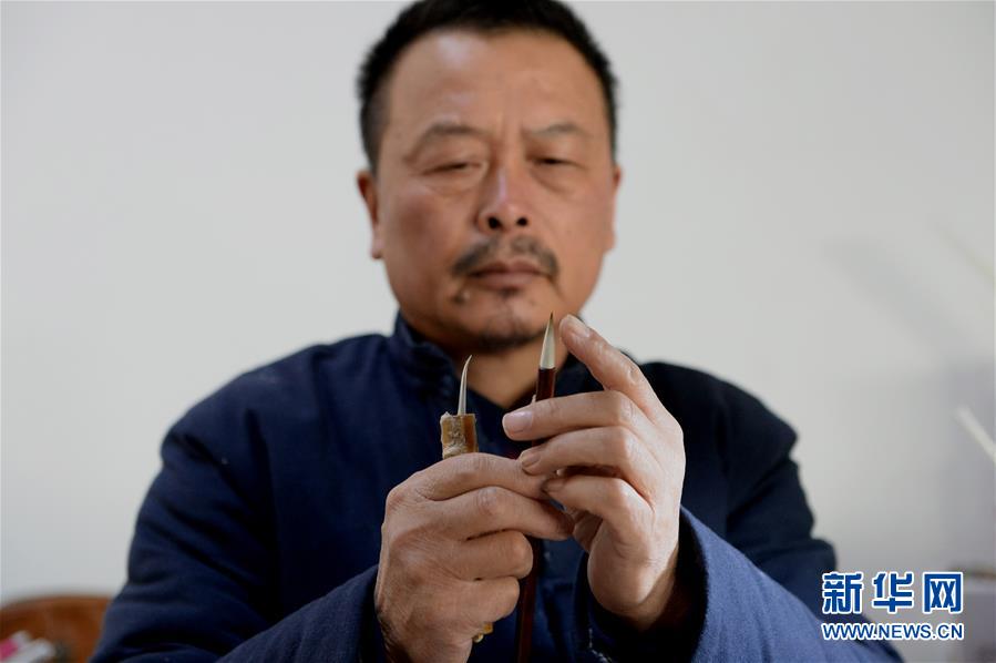 12月4日,佘征军在泾县“守艺人”工作室校笔锋。 新华社发(黄博涵摄)