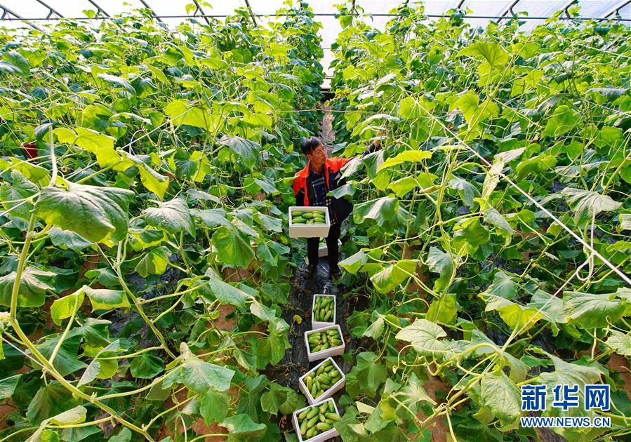 12月5日,河北省滦州市九百户镇的一位农民在自家温室大棚内采摘黄瓜。 入冬以来,冀东地区的唐山、秦皇岛等地农民纷纷投入冬季暖棚果蔬的管理、收获、农产品加工等工作中,变“冬闲”为“冬忙”。 新华社记者 杨世尧 摄