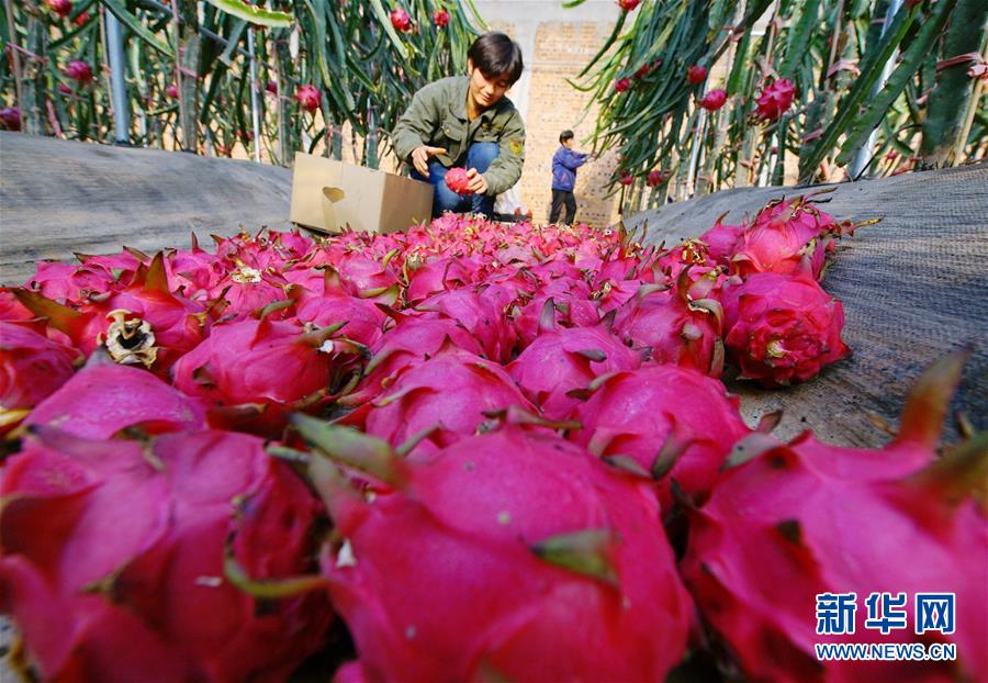12月5日,河北省滦州市鸡冠山生态农业产业园的工人在温室大棚内采摘火龙果。 入冬以来,冀东地区的唐山、秦皇岛等地农民纷纷投入冬季暖棚果蔬的管理、收获、农产品加工等工作中,变“冬闲”为“冬忙”。 新华社记者 杨世尧 摄