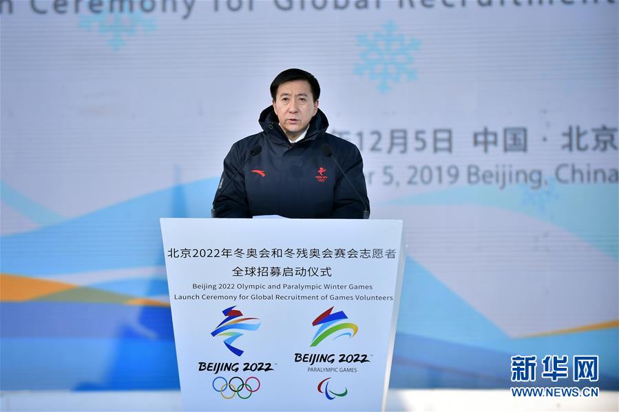 12月5日,北京市副市长、北京冬奥组委执行副主席张建东在仪式上致辞。当日是第34个国际志愿者日,北京2022年冬奥会和冬残奥会赛会志愿者全球招募正式启动。北京冬奥组委计划招募2.7万名冬奥会赛会志愿者,1.2万名冬残奥会赛会志愿者。新华社发(彭子洋 摄)