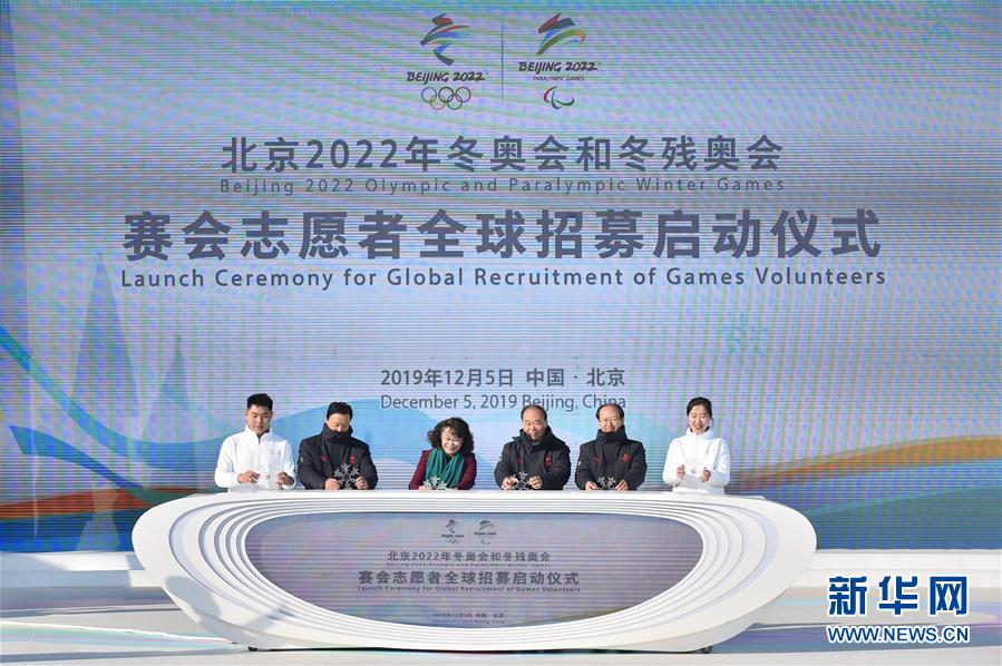 12月5日,北京冬奥组委副主席、河北省副省长徐建培(右三)、中国残联主席、北京冬奥组委执行主席张海迪(左三)、北京冬奥组委副主席杨树安(左二)、中国残联党委书记、理事长、北京冬奥组委副主席周长奎(右二)以及志愿者代表发布志愿者标志。当日是第34个国际志愿者日,北京2022年冬奥会和冬残奥会赛会志愿者全球招募正式启动。北京冬奥组委计划招募2.7万名冬奥会赛会志愿者,1.2万名冬残奥会赛会志愿者。新华社发(彭子洋 摄)