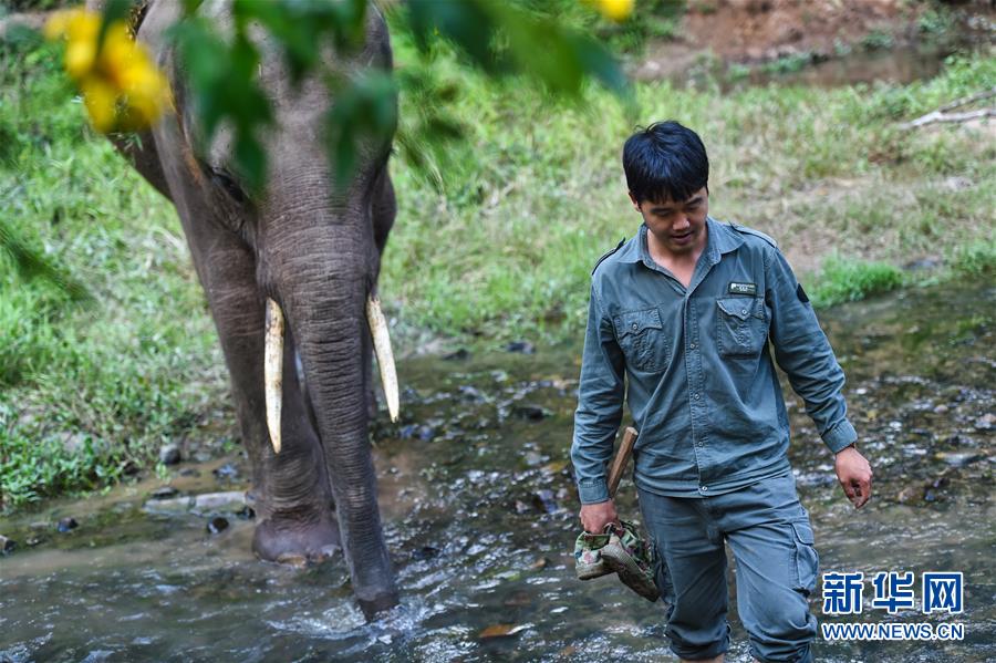 在中国云南亚洲象种源繁育及救助中心附近,“象爸爸”王国兵带领亚洲象越过一条小溪(11月12日摄)。新华社记者 李芒茫 摄