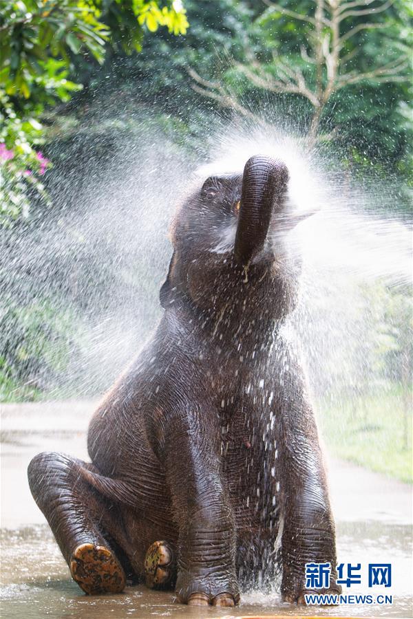 在中国云南亚洲象种源繁育及救助中心,亚洲象“小强”享受淋浴(11月12日摄)。 新华社记者 金林鹏 摄