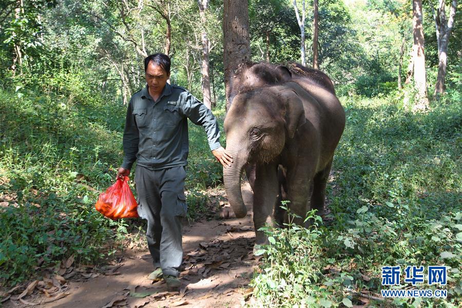 在中国云南亚洲象种源繁育及救助中心附近,“象爸爸”自建民带领亚洲象参加野化训练(11月13日摄)。 新华社记者 金林鹏 摄