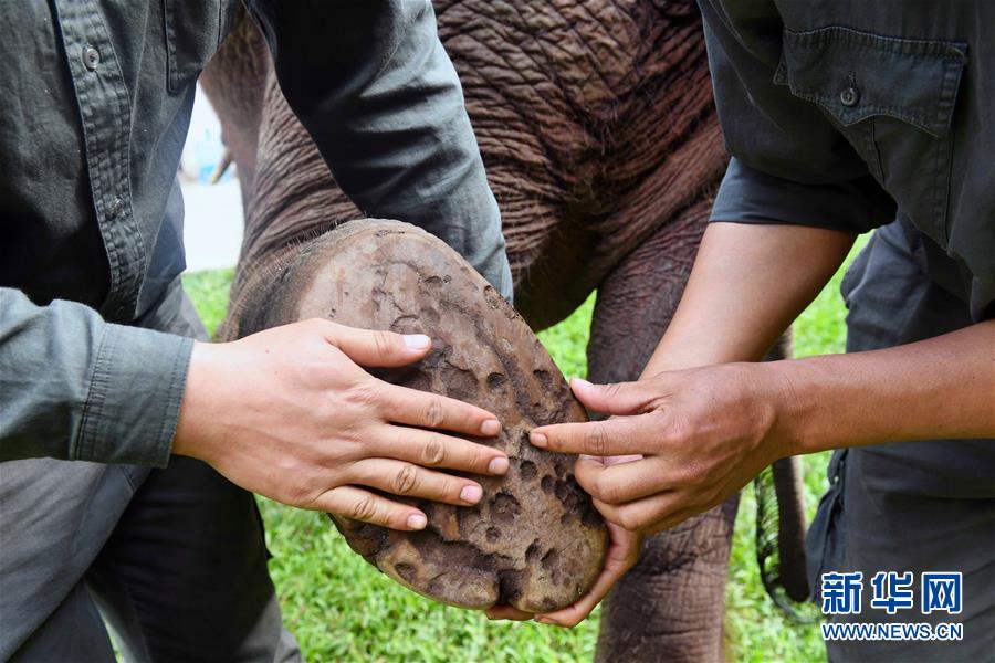 在中国云南亚洲象种源繁育及救助中心,”象爸爸“检查一只亚洲象的脚掌(11月12日摄)。新华社记者 杨宗友 摄