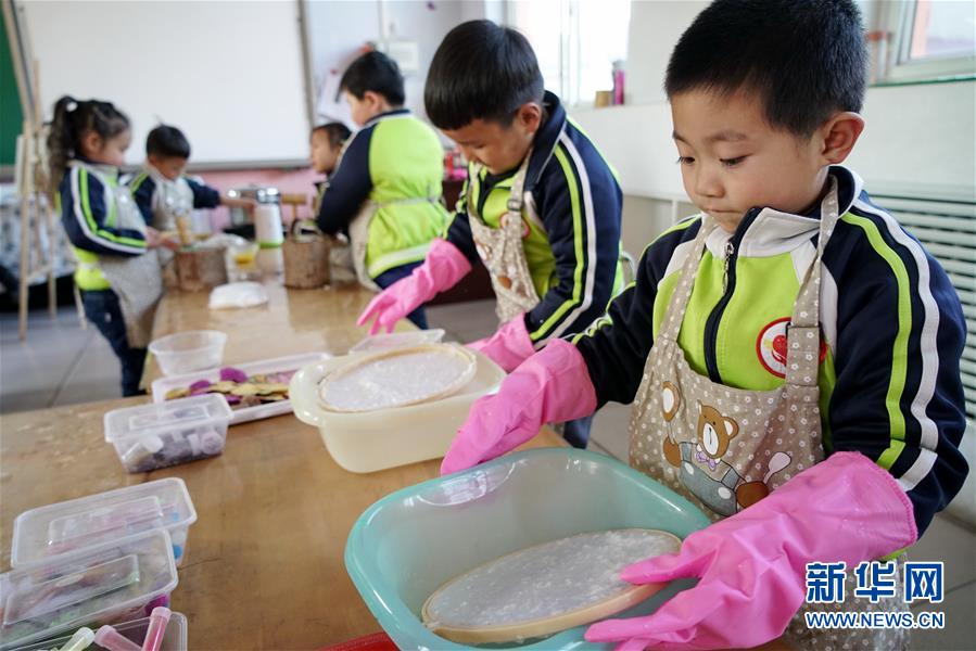 12月6日,河北省滦州市古马镇兴隆庄幼儿园的小朋友在体验古法造纸。 近年来,河北省滦州市依托本地乡土文化资源,在城乡中小学、幼儿园开设纺织、造纸等特色课程和体验活动,在寓教于乐中提升孩子们对传统文化的认知。 新华社记者 牟宇 摄