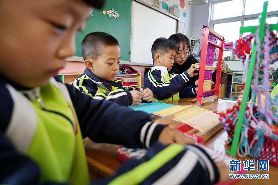 12月6日,河北省滦州市古马镇兴隆庄幼儿园的老师带领小朋友体验纺织。 近年来,河北省滦州市依托本地乡土文化资源,在城乡中小学、幼儿园开设纺织、造纸等特色课程和体验活动,在寓教于乐中提升孩子们对传统文化的认知。 新华社记者 牟宇 摄