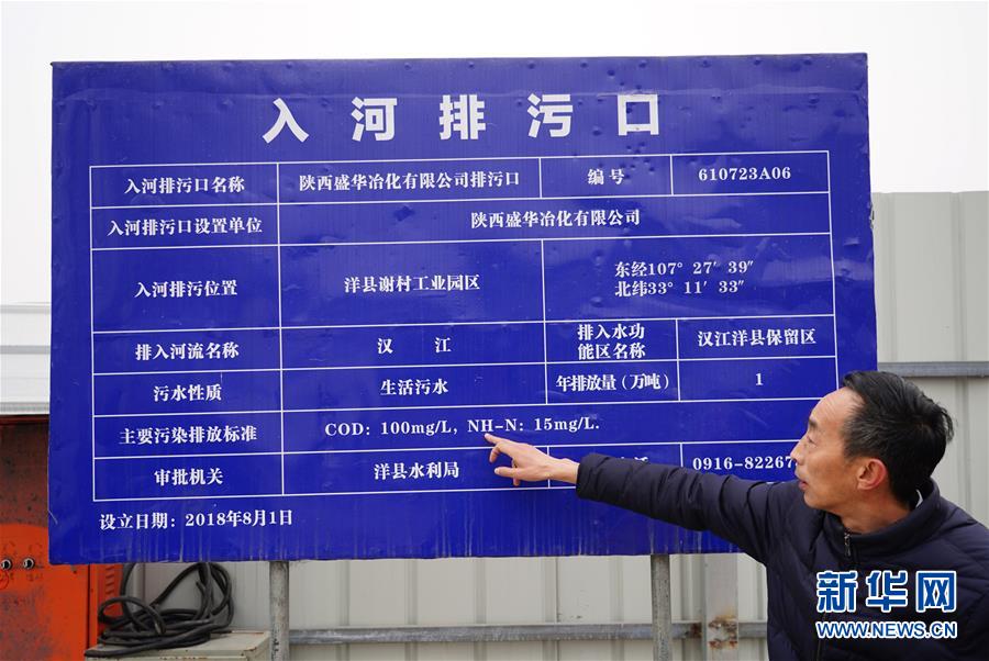 位于汉中市洋县的一家冶金公司负责人展示厂区的排污标志牌(1月10日摄)。标志牌上有地理位置坐标、主要污染排放标准等信息,便于监管。 汉江是南水北调中线工程的重要水源。近年来,汉江上游的核心水源涵养地——陕西省汉中、安康两市持续推进水源区生态保护工作,多措并举管控水环境污染,对可能使水质受影响的多种产业施行限制淘汰,使汉江出陕断面水质常年保持在国家地表水Ⅱ类标准,保证“一江清水润北方”。 新华社记者 邵瑞 摄