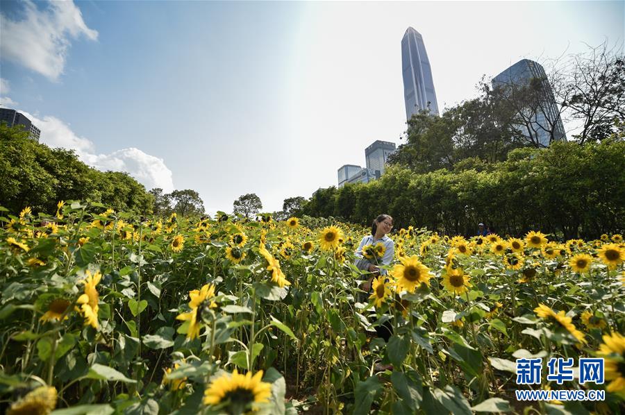 游客在位于深圳市中心的向日葵园里游玩(2018年3月12日摄)。 新华社记者 毛思倩 摄