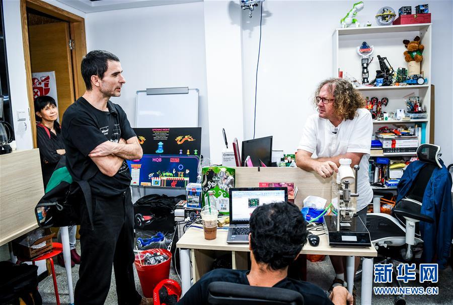 在深圳市福田区华强北一个创客孵化器内,来自荷兰阿姆斯特丹的卫国(右一)与来自不同国家的创客交流(2018年10月25日摄)。 新华社记者 毛思倩 摄