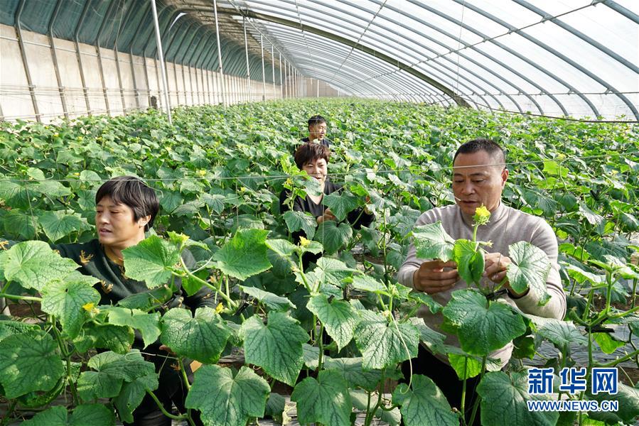 12月8日,河北省滦州市茨榆坨镇芦苇庄村建民种植专业合作社党员张建民(前右)在黄瓜种植大棚内劳作。 近年来,河北省滦州市茨榆坨镇坚持以农村基层党建引领乡村发展,以特色产业为抓手,推行“基层党支部+合作社+农户”的发展模式,大批合作社通过自建或挂靠村集体的方式成立了党支部、党小组,有力带动合作社成员增收致富,助推产业兴旺。 新华社记者 牟宇 摄