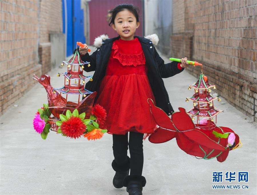 12月8日,河北省永清县后奕镇坚固庄村一名小朋友展示自家扎制的灯笼。新华社记者 李晓果 摄