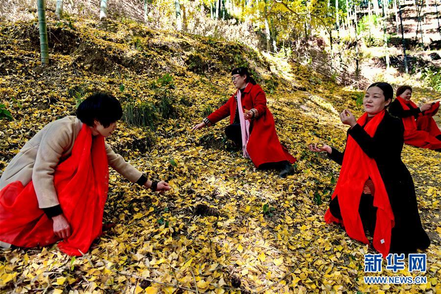 12月8日,游客在政和县铁山镇大岭村游览。冬日,福建省政和县铁山镇大岭村的银杏树叶一片金黄,美不胜收。新华社记者 张国俊 摄