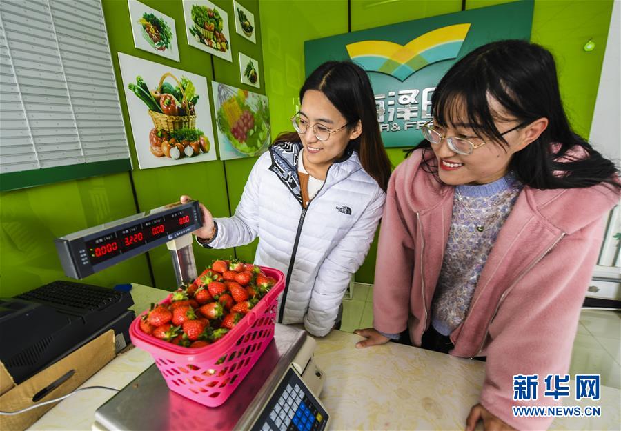 12月9日,在永清县永清镇海泽田现代农业园游客中心,游客将刚采摘的草莓过秤。 时下,河北省永清县永清镇海泽田现代农业园种植的“牛奶草莓”进入采摘季,吸引众多游客前来采摘。 新华社记者 李晓果 摄