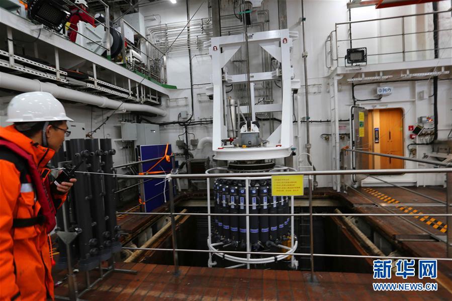 12月9日,科考队员首次利用“雪龙2”号月池系统进行CTD采水作业。 新华社记者 刘诗平 摄