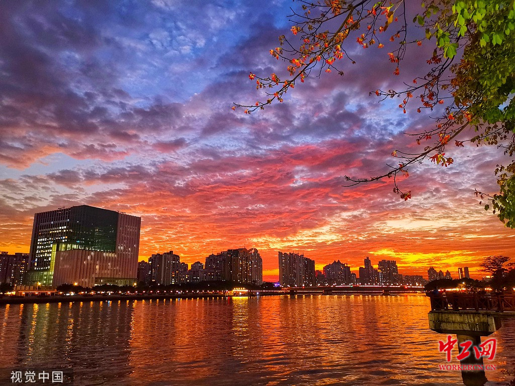 广州晚霞当空 珠江两岸建筑批艳丽外衣
