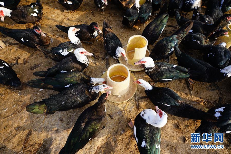 12月11日,河北省邢台市公安局驻新河县白穴口村扶贫工作队饲养的非洲雁在吃食。新华社记者 邢广利 摄