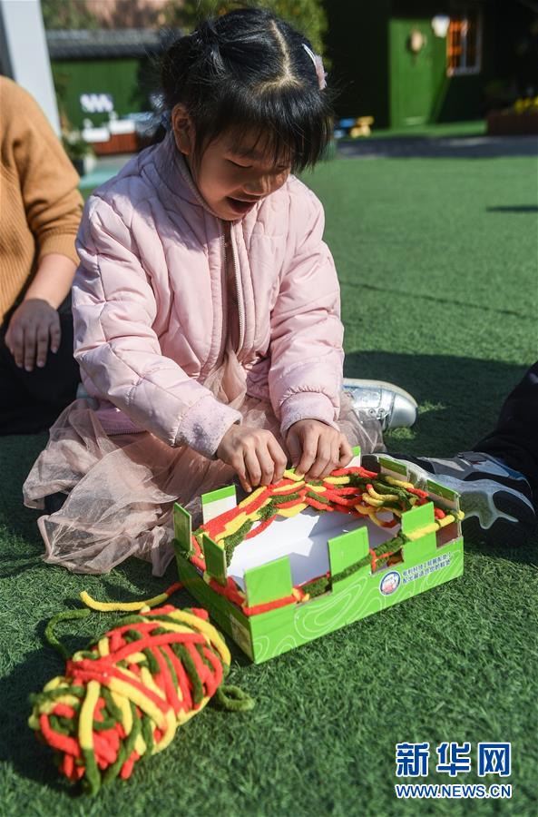 12月11日,小朋友用纸盒制作的工具编织爱心围巾。 新华社记者 徐昱 摄