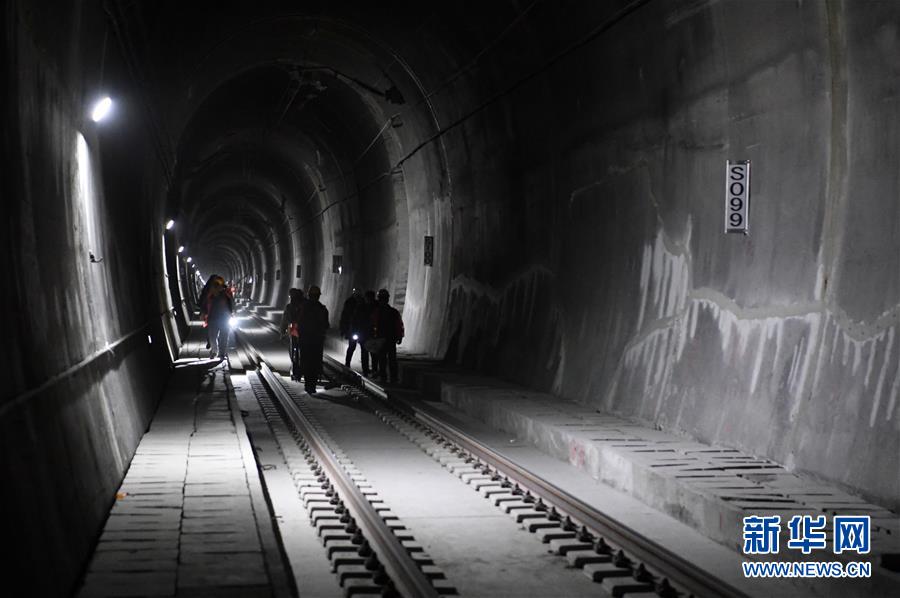 在敦格铁路当金山隧道,施工人员在隧道内进行检查(12月11日摄)。 经过建设者六年多的奋斗和努力,由中铁十七局集团有限公司承建的敦(煌)格(尔木)铁路当金山隧道已完成各项建设和测试任务,预计本月正式投入使用。 敦格铁路当金山隧道是敦格铁路全线控制性工程,穿越阿尔金山和祁连山两大山脉,隧道全长20.1公里,为国内特长的单洞单线隧道之一。 新华社记者 范培珅 摄