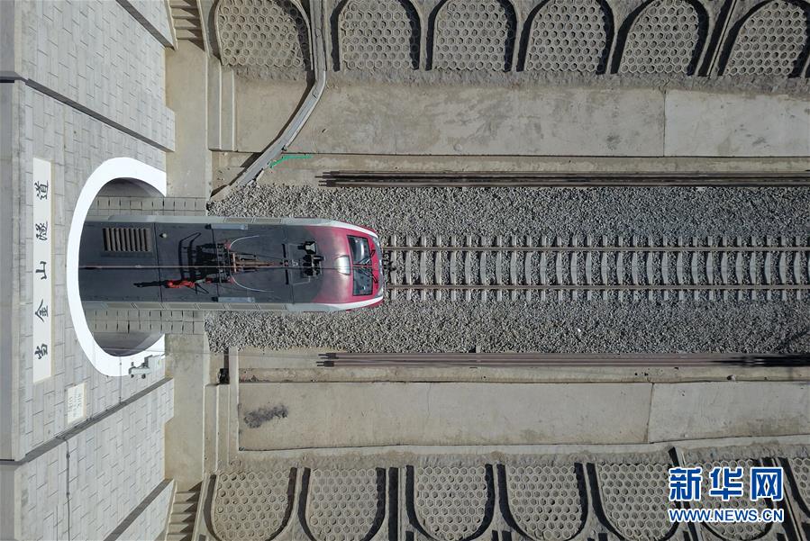 一辆检测列车驶出敦格铁路当金山隧道(12月12日无人机拍摄)。 经过建设者六年多的奋斗和努力,由中铁十七局集团有限公司承建的敦(煌)格(尔木)铁路当金山隧道已完成各项建设和测试任务,预计本月正式投入使用。 敦格铁路当金山隧道是敦格铁路全线控制性工程,穿越阿尔金山和祁连山两大山脉,隧道全长20.1公里,为国内特长的单洞单线隧道之一。 新华社记者 范培珅 摄