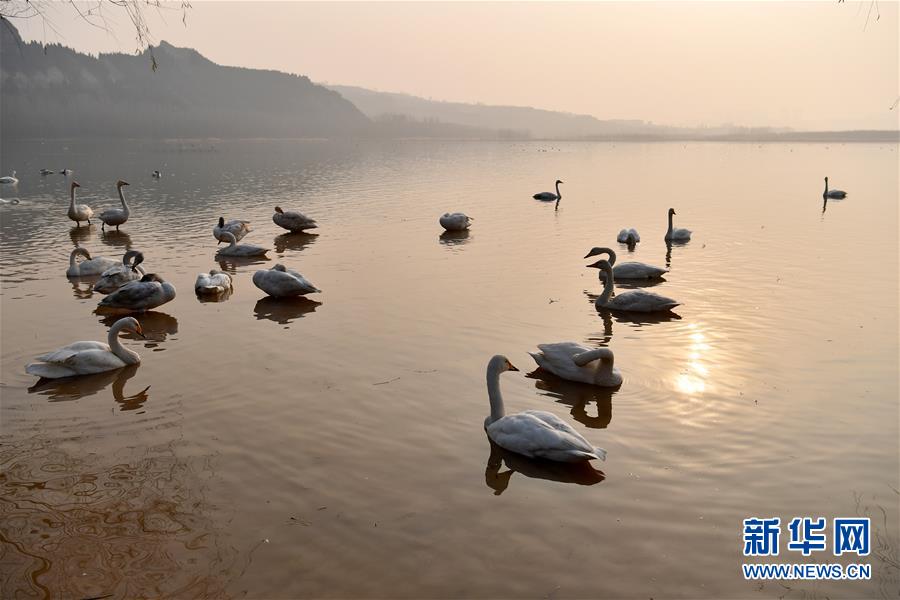 12月13日,白天鹅在山西平陆黄河湿地水面上游弋。新华社记者 詹彦 摄