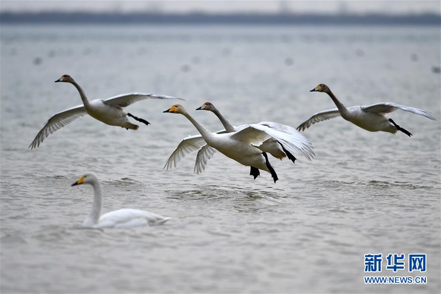 12月12日,白天鹅在山西平陆黄河湿地飞翔。新华社记者 詹彦 摄