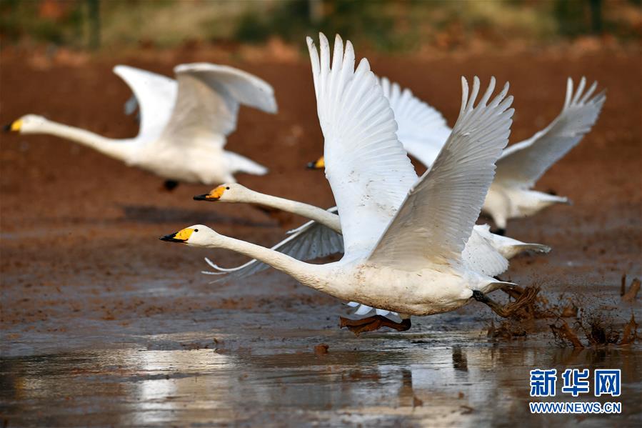 12月13日,白天鹅在山西平陆黄河湿地起飞。新华社记者 詹彦 摄
