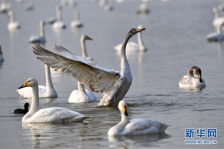 12月13日,白天鹅在山西平陆黄河湿地嬉戏。新华社记者 詹彦 摄