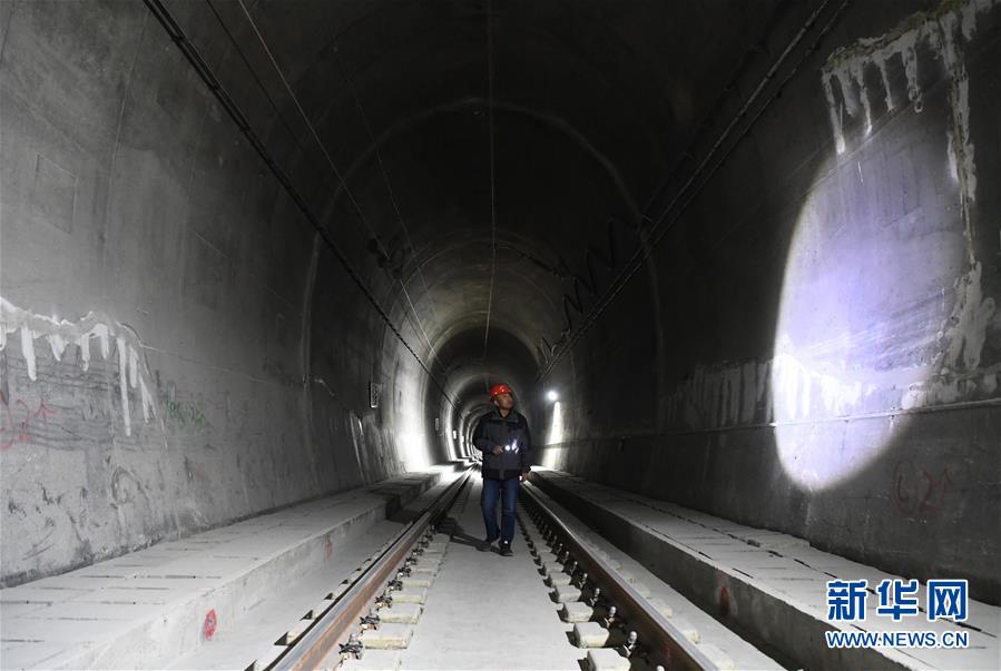 独云龙在敦格铁路当金山隧道内巡查(12月11日摄)。新华社记者 范培珅 摄