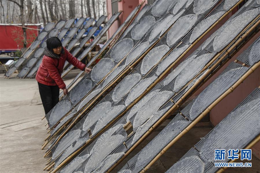 12月14日,山东省枣庄市峄城区阴平镇小石泉村粉皮加工协会的成员在晾晒粉皮。新华社记者 范长国 摄